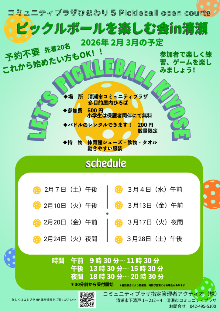 今話題のニュースポーツ、ピックルボール。卓球、バドミントン、テニスのいいとこどりで誰でも楽しめるスポーツです。このニュースポーツを地域で楽しむコミュニティの場としたい、との思いからこの会を始めました。現在は参加者で自主的に練習やゲームを楽しんでいます。指導者やコーチはいません。体験してみたい方も歓迎です。最初に簡単なレクチャ―を担当職員から受けられますので、その日のうちに楽しくゲームができるようになります。小学生からシニアの方、また初めての方も経験者も一緒に楽しみましょう。参加者にはネットの準備や会場の片づけもお願いしています。開催日は不定期ですが、週一回の開催を目指します。清瀬市以外の近隣の方も是非どうぞ!